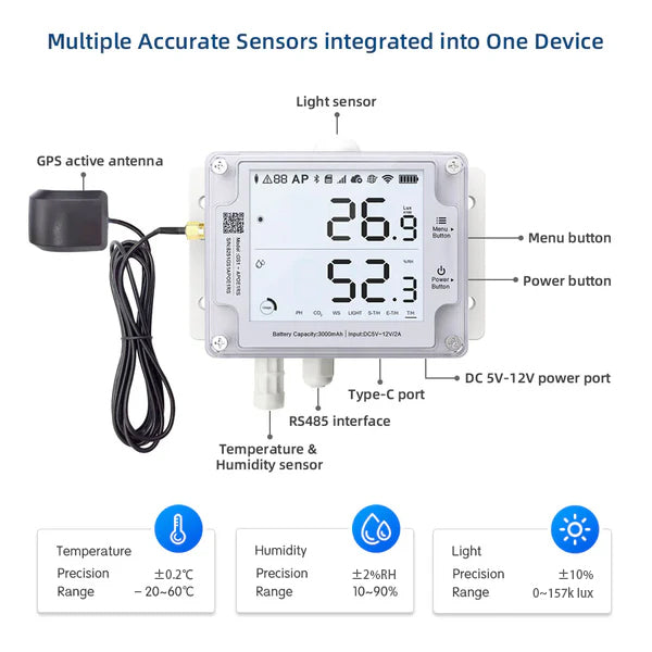 Temperature ±0.2°C, Humidity ±2%, Light ±2%